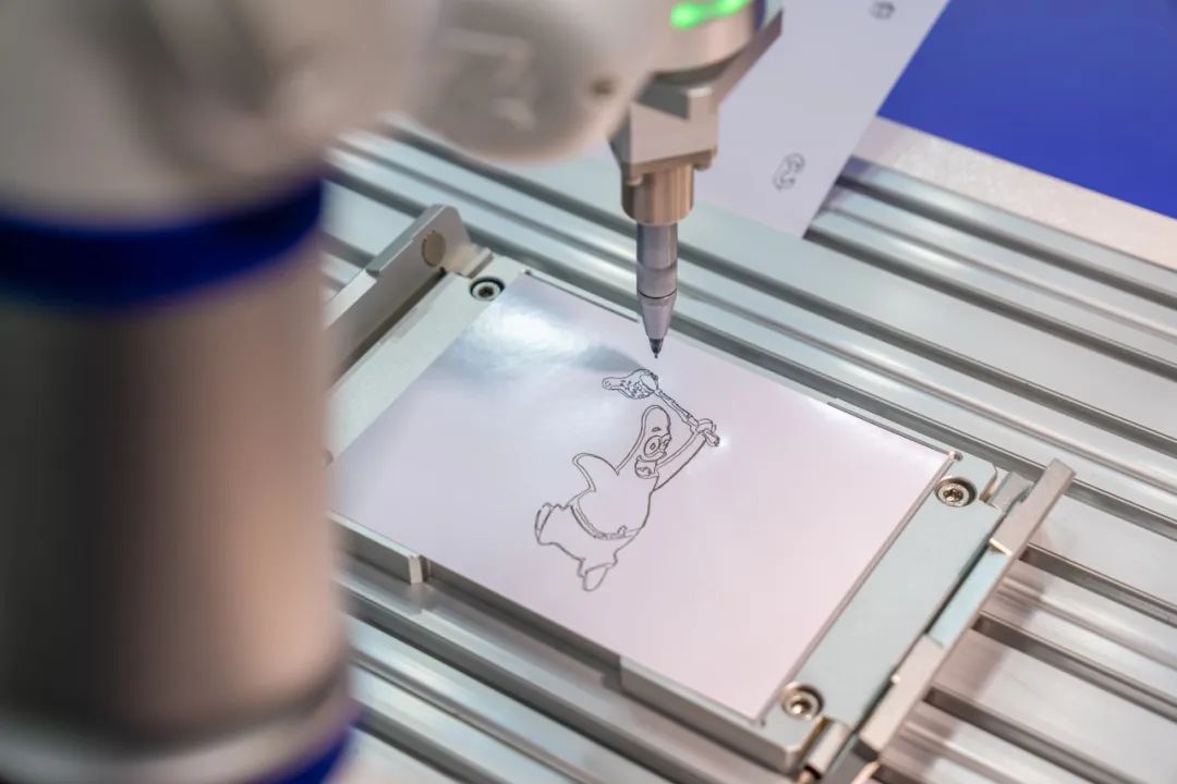 針對(duì)AI課程教學(xué)、人機(jī)互動(dòng)表演等教育行業(yè)場(chǎng)景,艾利特繪畫機(jī)器人搭配攝像頭及上位機(jī),可拍攝圖像并將其輪廓轉(zhuǎn)換為機(jī)器人軌跡數(shù)據(jù),通過(guò)SDK接口向機(jī)器人發(fā)送。機(jī)器人對(duì)接收到的軌跡數(shù)據(jù)進(jìn)行實(shí)時(shí)樣條插補(bǔ),解決上位機(jī)軌跡數(shù)據(jù)不連續(xù)、通信延遲不可控的問(wèn)題后,平穩(wěn)柔順地完成繪畫動(dòng)作。