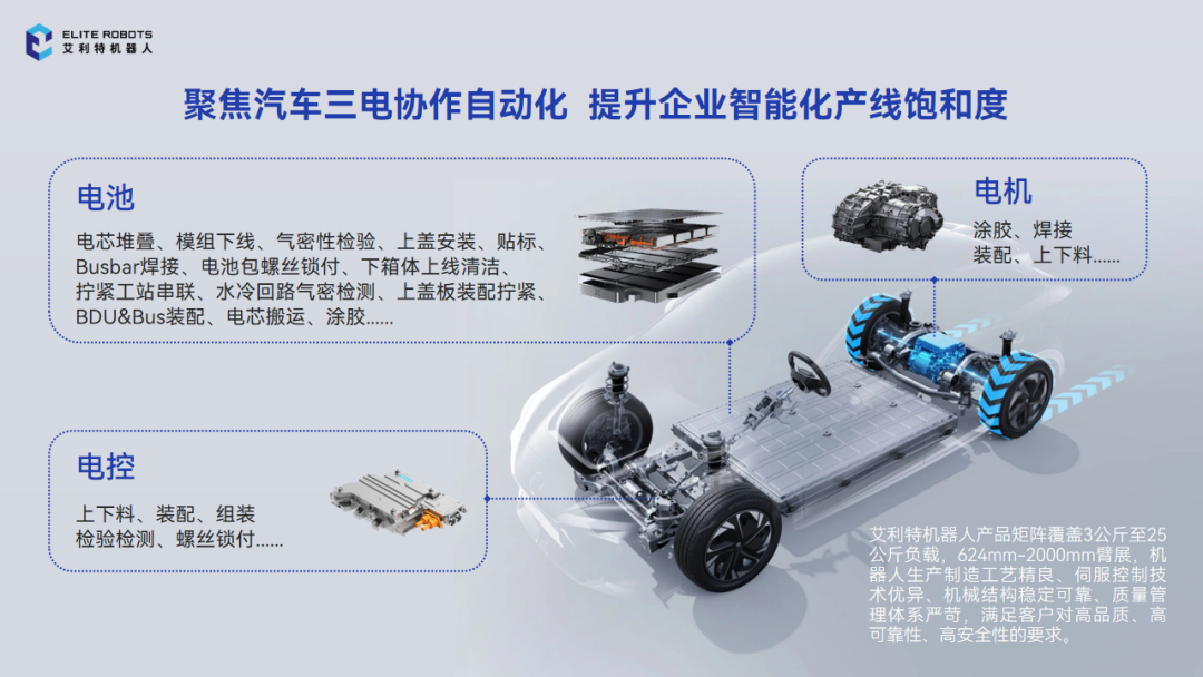 目前,艾利特機器人產品矩陣覆蓋3公斤至25公斤負載,624mm-2000mm臂展,機器人生產制造工藝精良、伺服控制技術優異、機械結構穩定可靠、質量管理體系嚴苛,滿足客戶對高品質、高可靠性、高安全性的要求,已廣泛應用于電池、電機、電控工藝。