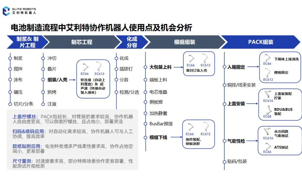 電芯段:為保證生產效率及產品一致性,疊片、焊接、封裝等工藝段協作機器人滲透率較高。主要用于電芯組裝中的電芯入殼搬運、頂蓋焊接搬運、組盤、注液搬運等,協作機器人布置更加靈活,不同機臺適應性強。