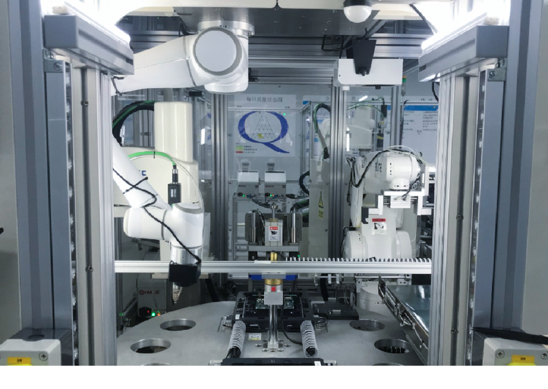 來料的條碼讀取和裝配檢查、螺絲擰緊的工位,機器人運行只需平面操作、節拍要求高,則由SCARA機器人執行;物料在不同工站的搬運和裝配則由高速的工業六軸機器人進行。