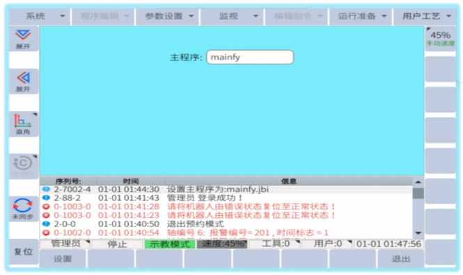 觸發(fā)輸入信號(X004),機械臂即可完成清除報警,抱閘,上使能,標定進入精確模式,運行主程序操作,再次觸發(fā)X004可暫停,如果機械臂報警,觸發(fā)(X004)也可清除報警,回主程序首行運行。