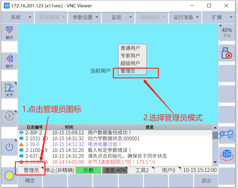 把U盤插入協作機器人機柜的 USB 口,USB 設備圖標將顯示在編程器屏幕的坐標區。登錄管理員模式(密碼333333),點擊系統---機器人升級----一鍵升級,彈出如下界面,點擊確定--直到升級完成。