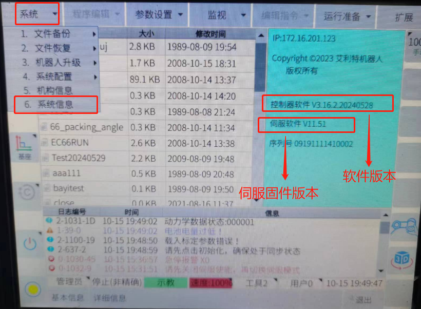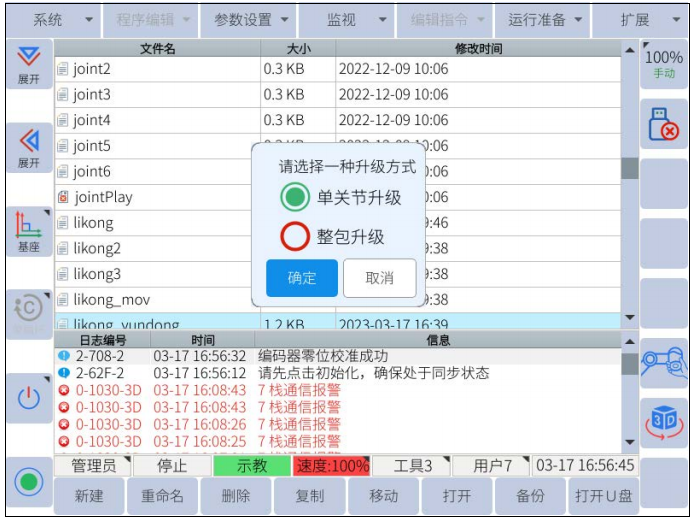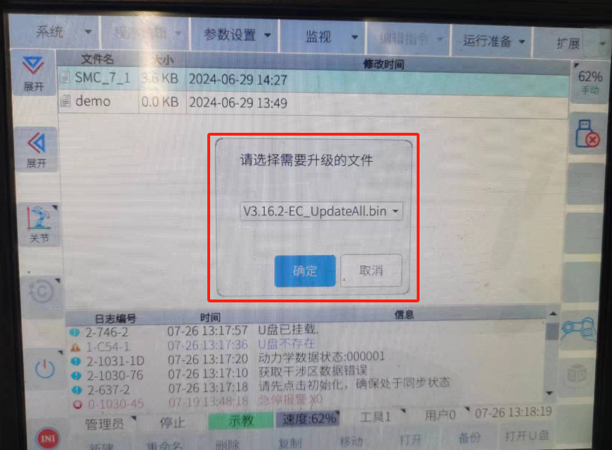 2.1.5 把U盤插到控制USB口上面,點擊系統---機器人升級----系統升級---選擇要升級的文件---點確定,等待幾分鐘升級完成后,系統會自動重啟。
