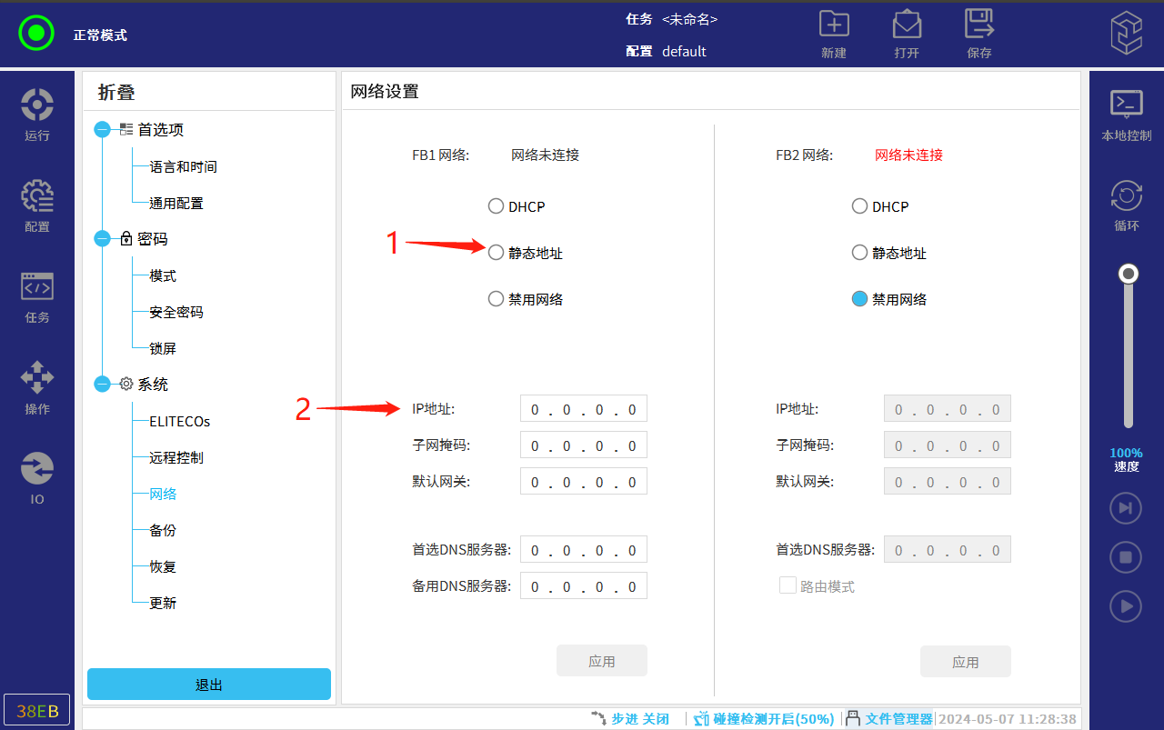 3. 選擇靜態(tài)地址,設(shè)置FB1網(wǎng)口的IP