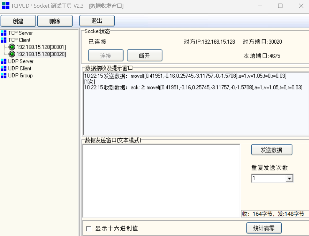 2. 用通訊助手創(chuàng)建一個(gè) 30001端口的客戶端,連接機(jī)器人并發(fā)送腳本使機(jī)器人進(jìn)入解釋器模式