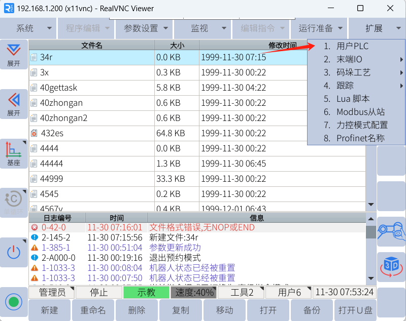 1. 用戶PLC的編寫只能在示教器上,在擴(kuò)展-用戶PLC中。