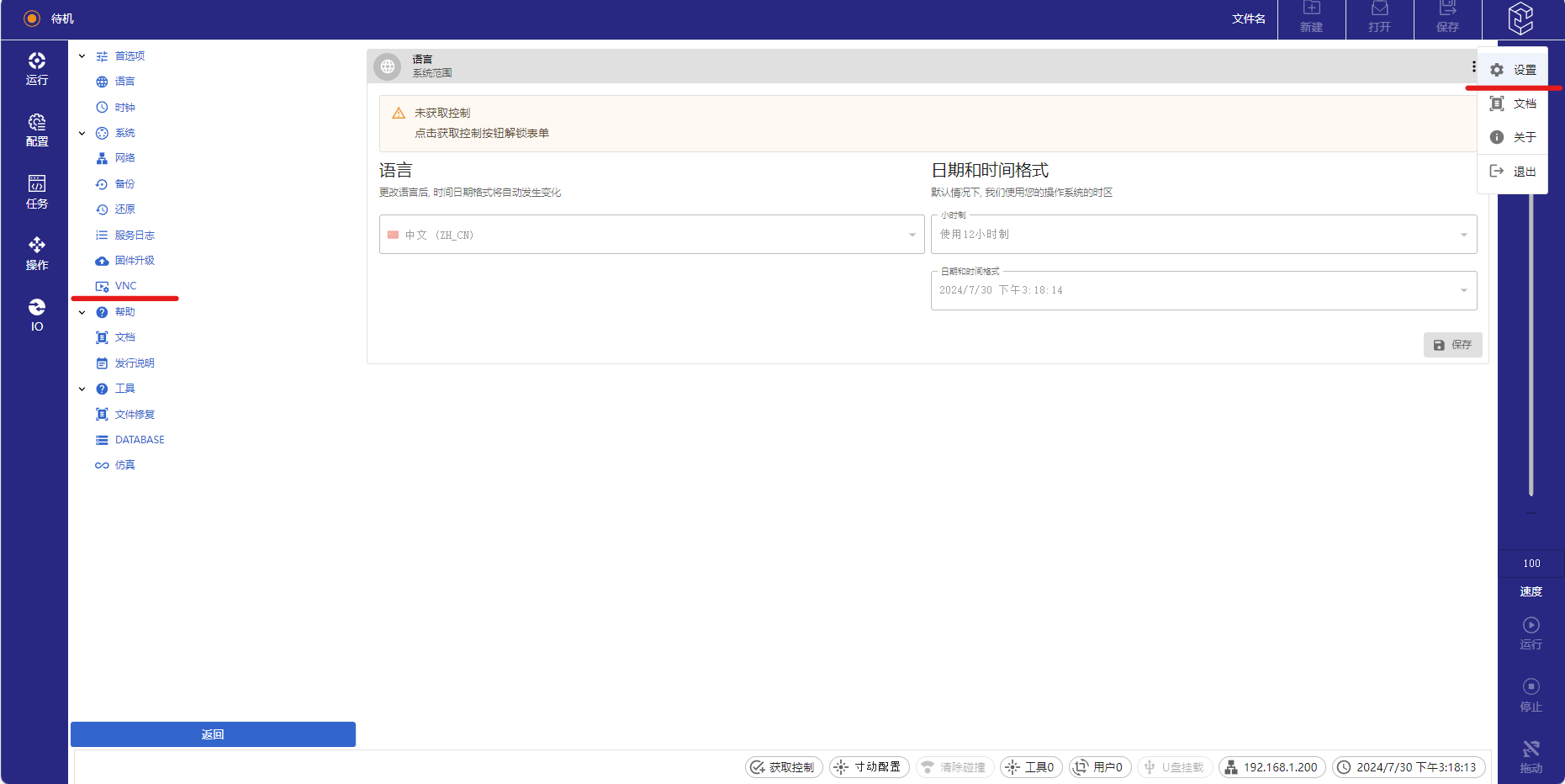 3.12及以上版本開始支持全新的網頁示教器,其功能更豐富,若還想在網頁示教器使用VNC功能按照如下步驟: 先點擊右上角艾利特logo,點擊設置,再點擊VNC即可進入