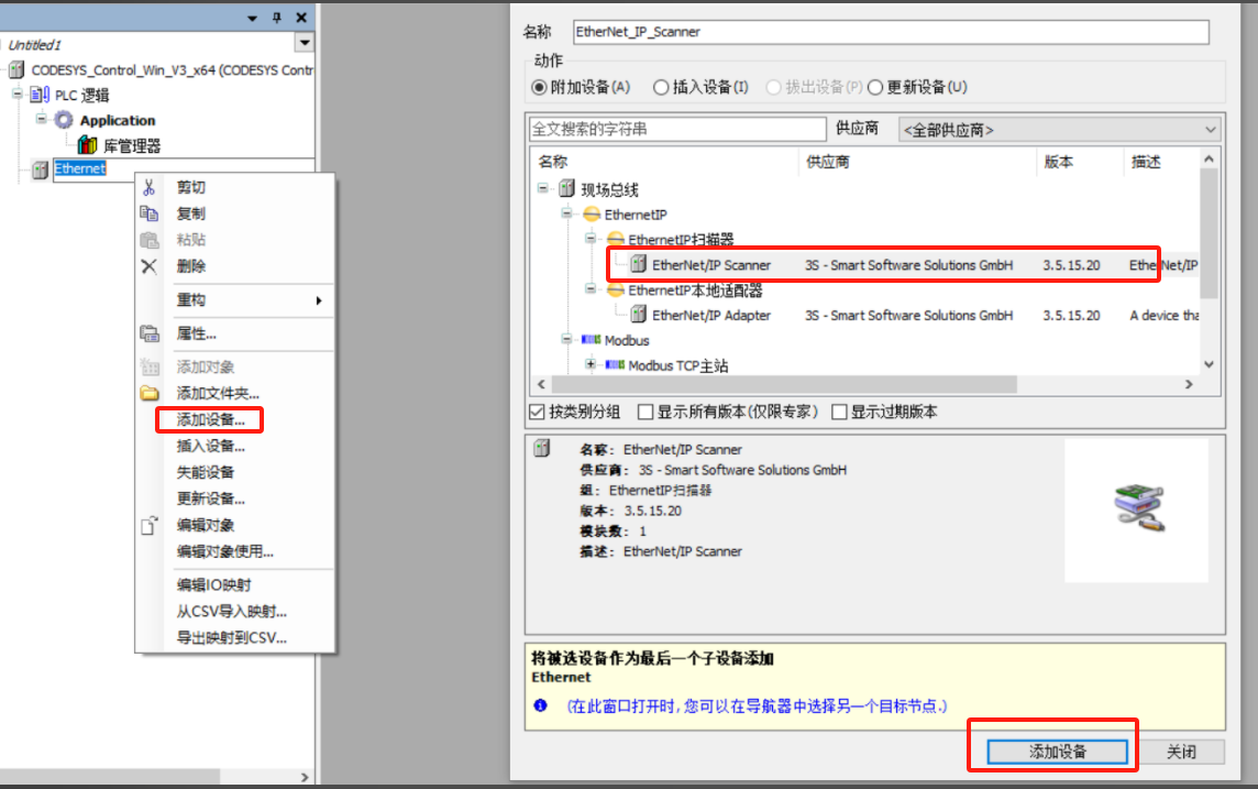 選擇新建設(shè)備 Untitled1,右鍵點(diǎn)擊添加設(shè)備,選擇對(duì)應(yīng)的 CODESYS Control Win V3 X64 中的 PLC,點(diǎn)擊添加設(shè)備