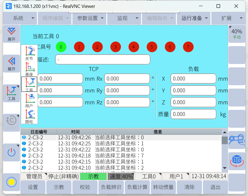 3.運行準備—工具負載設置—選擇一個工具號,左下角設置使工具號變成綠色即可打開。