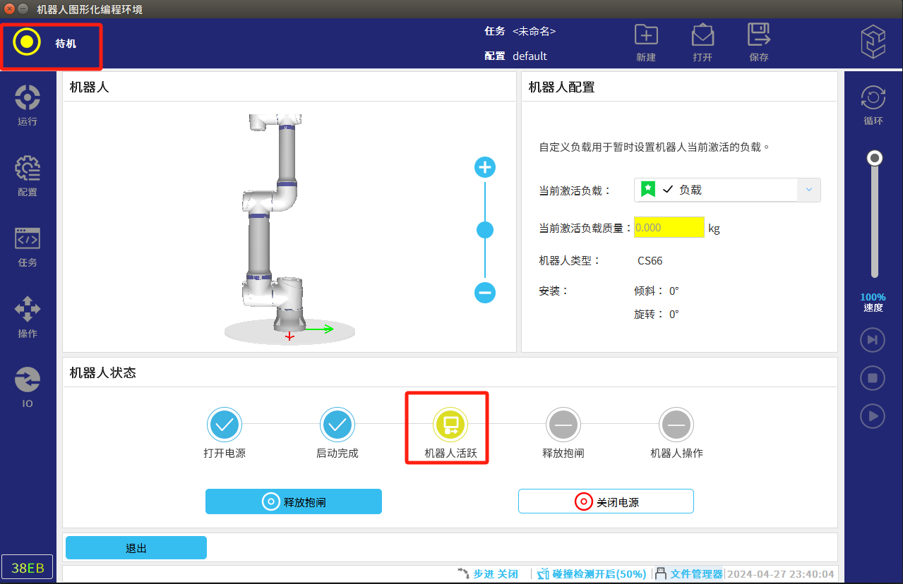 - 機器人顯示”待機“狀態后退出,進入運行頁面,切換狀態