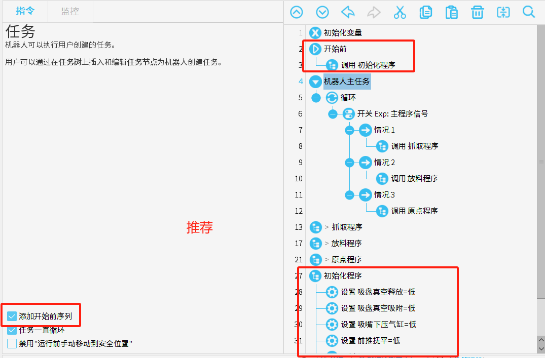 推薦在主程序里加循環,防止有人更改循環模式,導致程序無法運行。