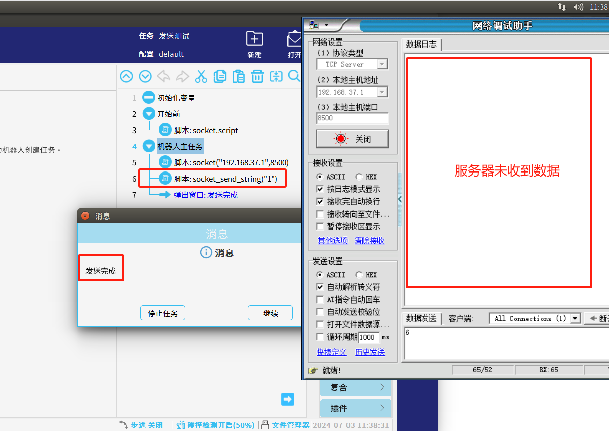1.我們單純的使用發送指令例如:socket_send_string(str, socket_name="socket_0")未判斷發送是否成功時,如果當機器人客戶端當時已經與服務器斷開連接了或發送失敗后程序依然往下繼續運行,如圖2-1所示。