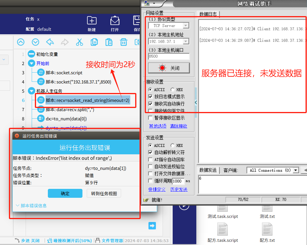 b:如果我們機器人客戶端未接收到數據程序依然會往下繼續運行,這樣就會影響我們的程序流程,如圖3-2所示(未接收到數據,程序依然往下運行,當運行到索引字符串轉換時沒有數據程序就會報錯,這時程序已經停止需要重新初始化程序)。