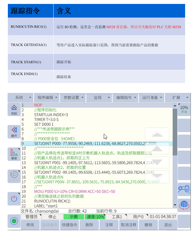 標定步驟:將物品放到傳送帶上緩慢開動傳送帶使物品經過傳感器(此時日志窗口顯示“io標定結束”)到達A點后,停止傳送帶運動,將機械臂移動尖點至A點并記錄A點和程序中的“P002”,此時可以退出標定頁面進入程序示教跟蹤軌跡(示教圖中應避免晃動物品)
