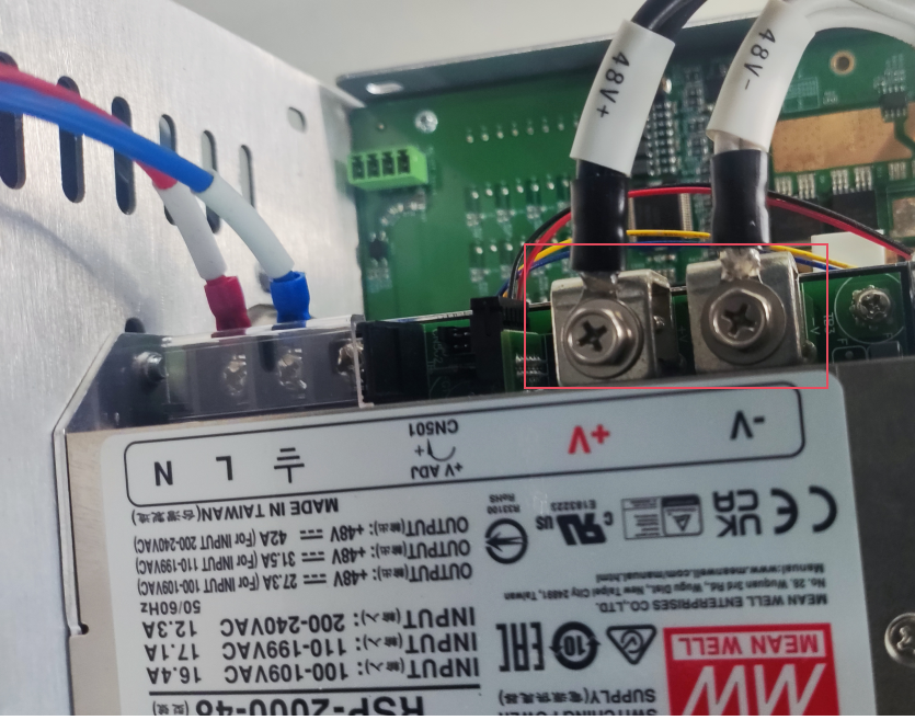 第二步:將機器人控制柜電源開關(guān)打開,將safeio板上啟動48V開關(guān)電源的線束拔掉,如圖-3紅框標記處,用萬用表測量是否有48V輸出,測量點如圖-4紅框標記處。如果有48V輸出,說明開關(guān)電源沒有問題,safeio板出現(xiàn)故障需要現(xiàn)場更換或者返廠維修;