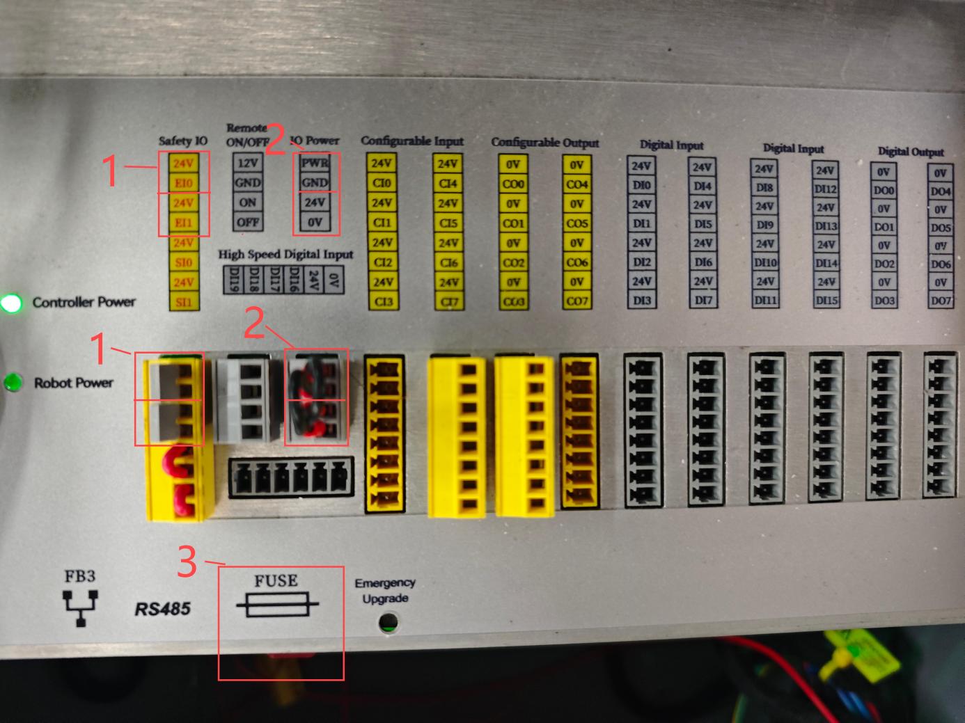 4.如以上均無異常,則可拔掉急停回路的黃色端子排,使用萬用表"直流電"檔位——排查“圖-1”的1號位置分別測試(24V-EI0,24V-EI1;引腳)是否有24V電壓,如無電壓,可檢查“圖-1”的3號位置的保險絲拆下來查看保險絲是否已經熔斷。