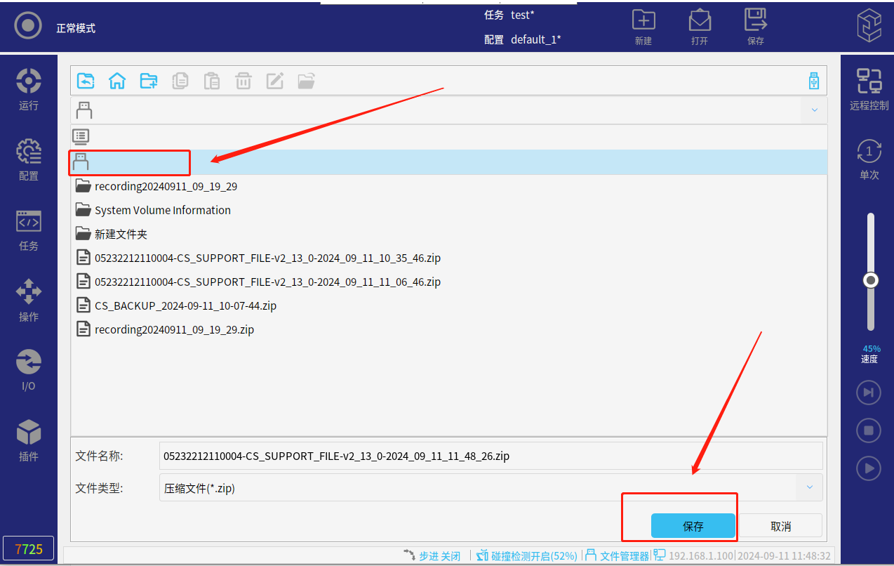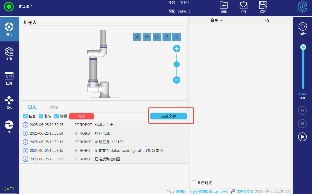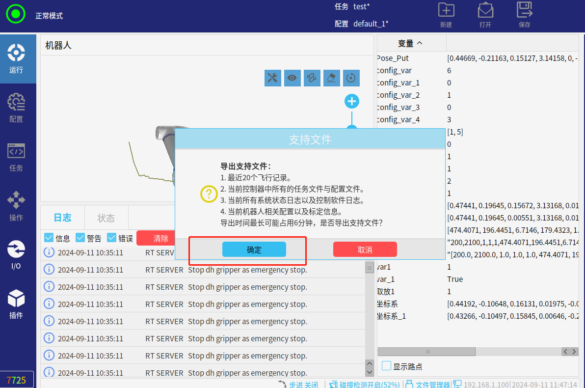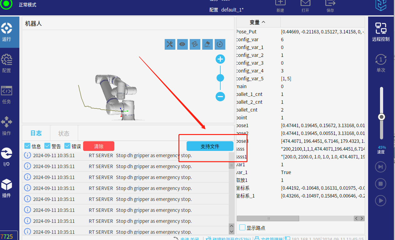 發(fā)送后機(jī)器人應(yīng)該會(huì)按照腳本指令運(yùn)動(dòng),無(wú)論是否運(yùn)動(dòng),我們都可以導(dǎo)出支持文件查看: