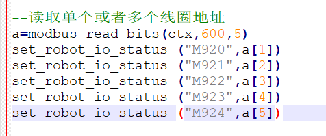 機器人讀取寄存器300-304寄存器數值同時存入到I0-I4寄存器中,腳本如下