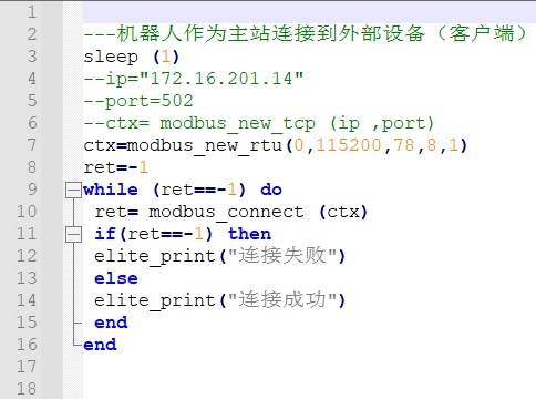ModBus主站功能通過lua腳本實現,可以參考EC-lua手冊進行使用。其中MODBUS MASTER為已經封裝的接口,用戶只需傳入相應參數即可;如有其他特殊協議要求,可以使用TCP/UDP通訊、485通訊、TCI通訊(工具末端485)和232通訊等。
