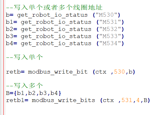 寫入單個和多個線圈指令,定義將M530數值寫入到線圈530,M531-M534數值分別寫入線圈531-534中