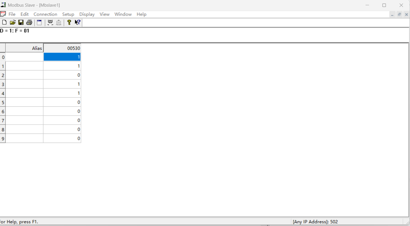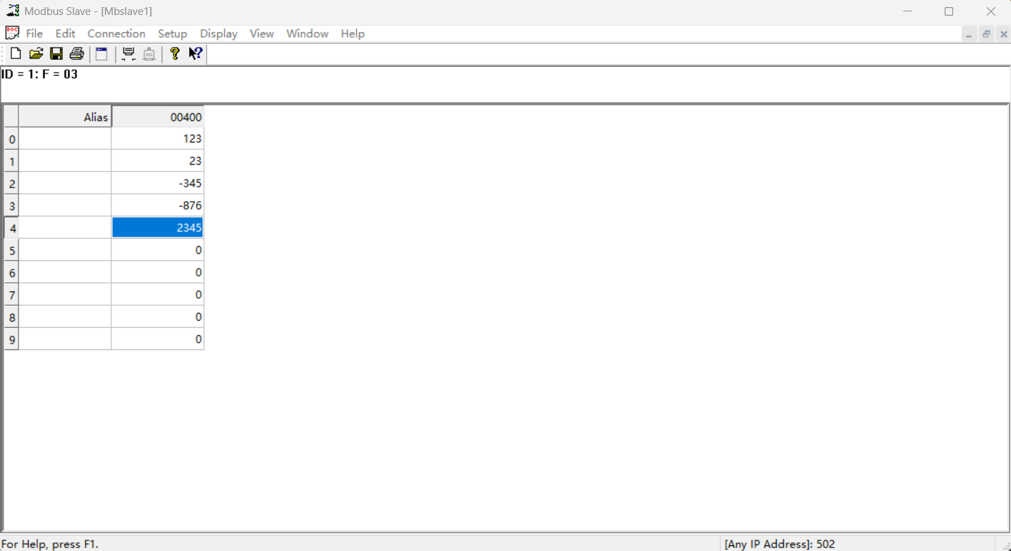 助手端將400寄存器設置為123,401寄存器設置為23,402寄存器設置為-345,403寄存器設置為-876,404寄存器設置為2345