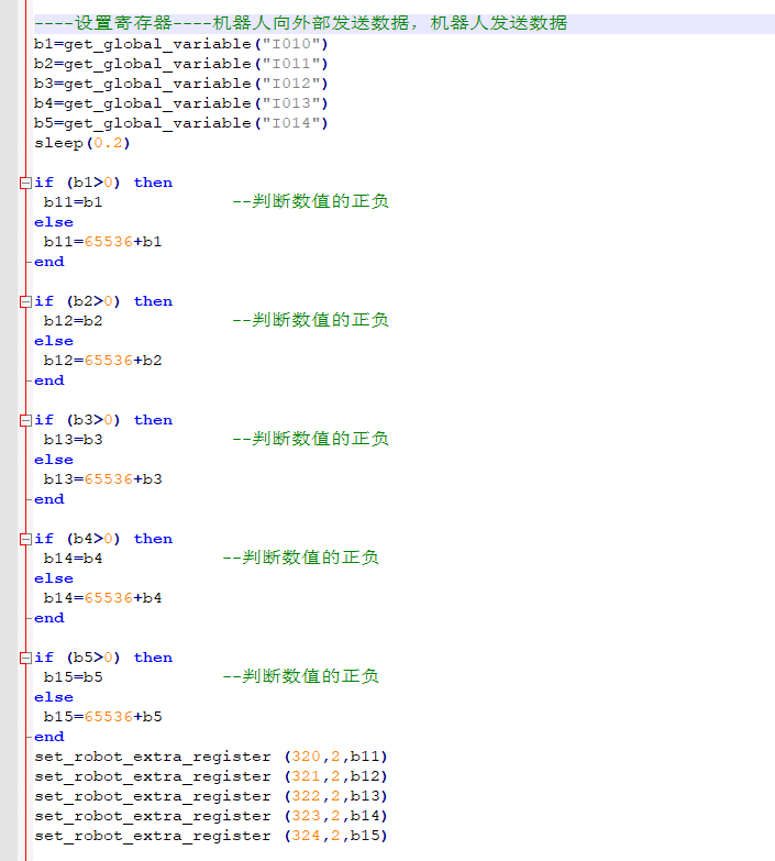 6.機器人通過全局變量I10-I14,將數據寫入寄存器320-324,腳本如下所示