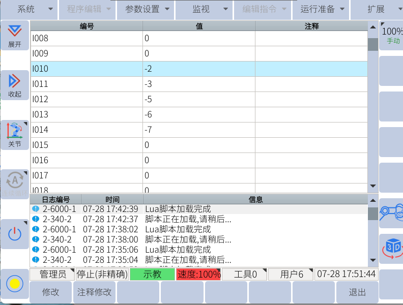 通過助手向寄存器300-304賦值,可通過示教器查看I0-I4數值,確實數值是否正確,如下圖所示