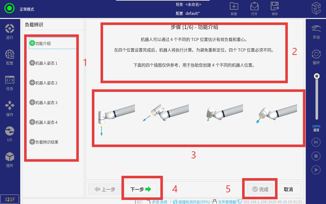 3. 按照下圖中所示機(jī)械臂位姿,設(shè)置4個(gè)不同的點(diǎn)位,設(shè)置好后點(diǎn)擊完成即可。