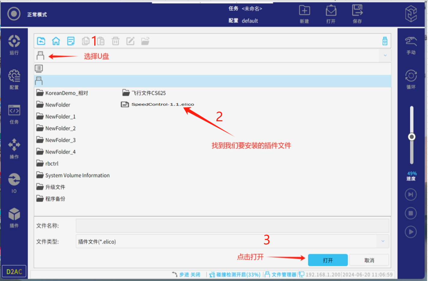 CS機器人在與外部設(shè)備進(jìn)行通訊時,通常會使用機器人內(nèi)部的寄存器進(jìn)行信息交互,機器人自帶可查看modbus寄存器,關(guān)于布爾寄存器、整數(shù)寄存器、浮點數(shù)寄存器的查看可安裝寄存器監(jiān)控器插件進(jìn)行查看,插件文件詢問艾利特人員方可獲得,存放至U盤內(nèi),并插入機器人示教器或控制柜USB接口。