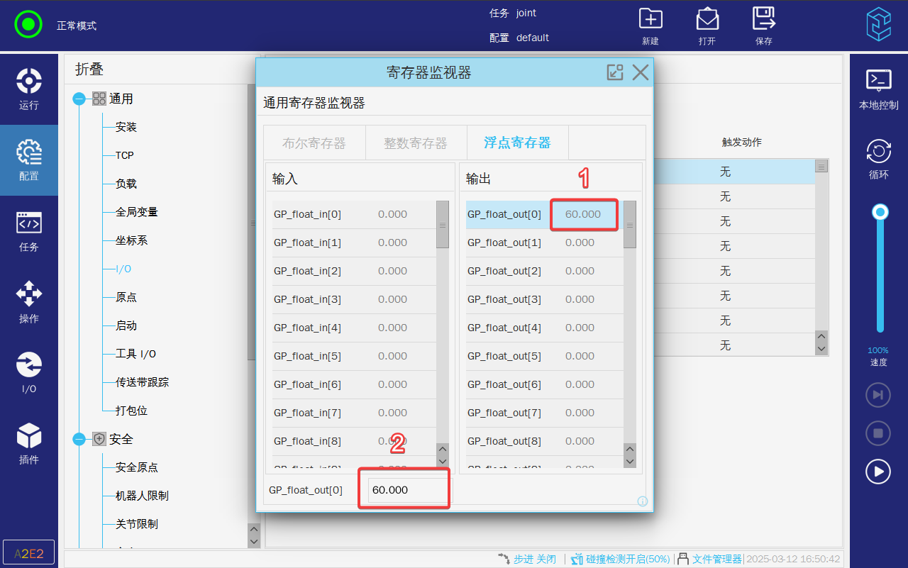 4. 浮點寄存器輸入輸出數(shù)量各47個,保留為總線通訊的輸入輸出各范圍是0-23,保留范圍外部RTSI客戶端通訊的輸入輸出范圍為23-47,(1)查看狀態(tài),(2)輸出浮點數(shù);