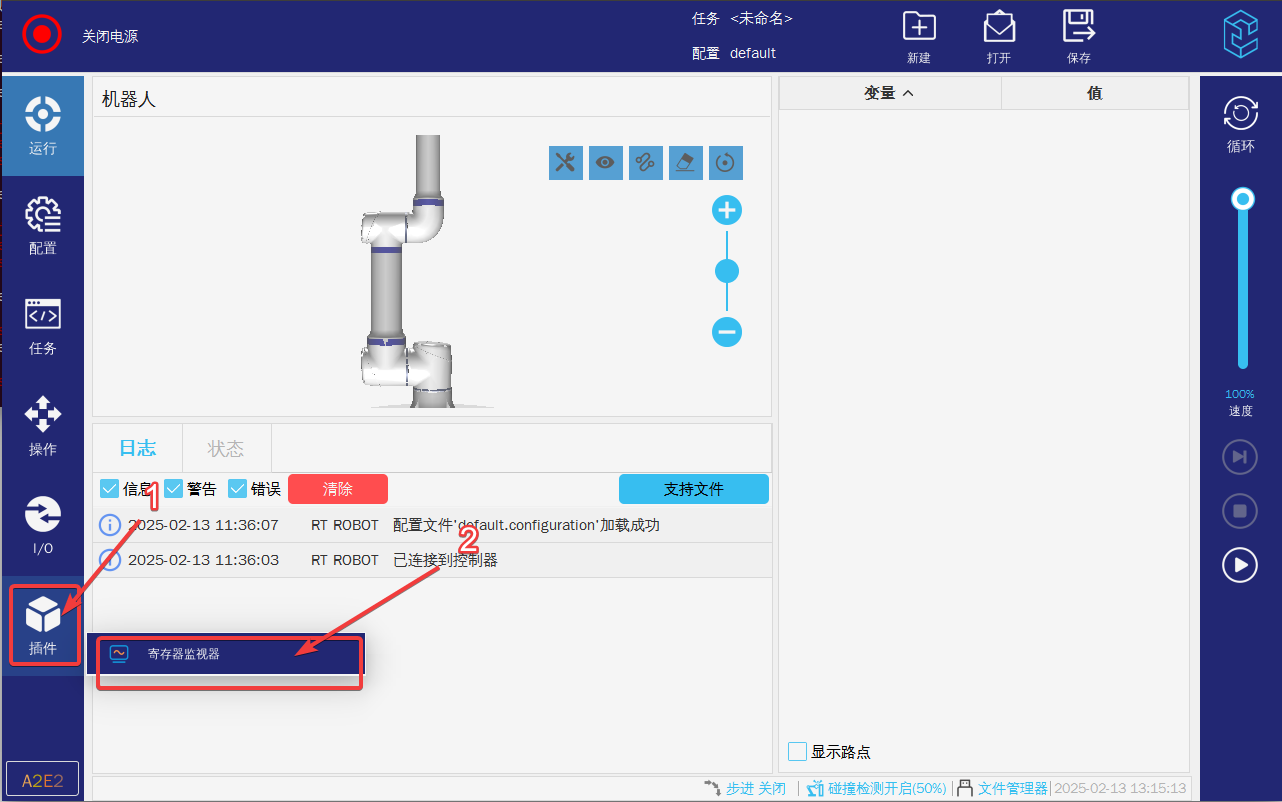 1. 點擊示教器屏幕左側(cè)底部插件按鈕,再點擊寄存器監(jiān)視器進(jìn)入插件界面;