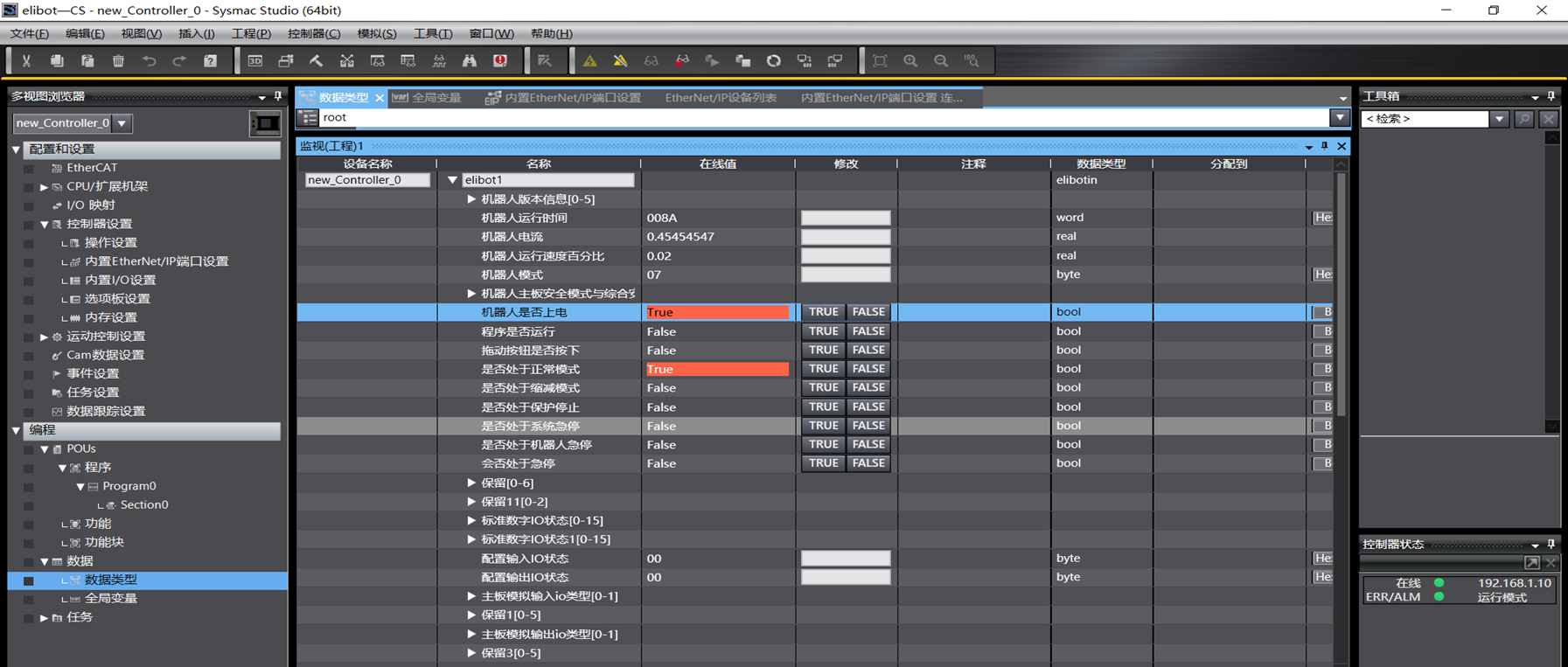 點(diǎn)擊【圖視】-【監(jiān)視窗口】開啟監(jiān)控窗口,【名稱】選項(xiàng)輸入建立的全局變量,可在線監(jiān)控子 變量的狀態(tài)