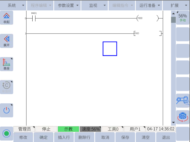 機器人進(jìn)入管理員權(quán)限(密碼:333333),導(dǎo)航到擴展 -> 用戶PLC,使用梯形圖關(guān)聯(lián)M401和需要輸出的數(shù)字IO