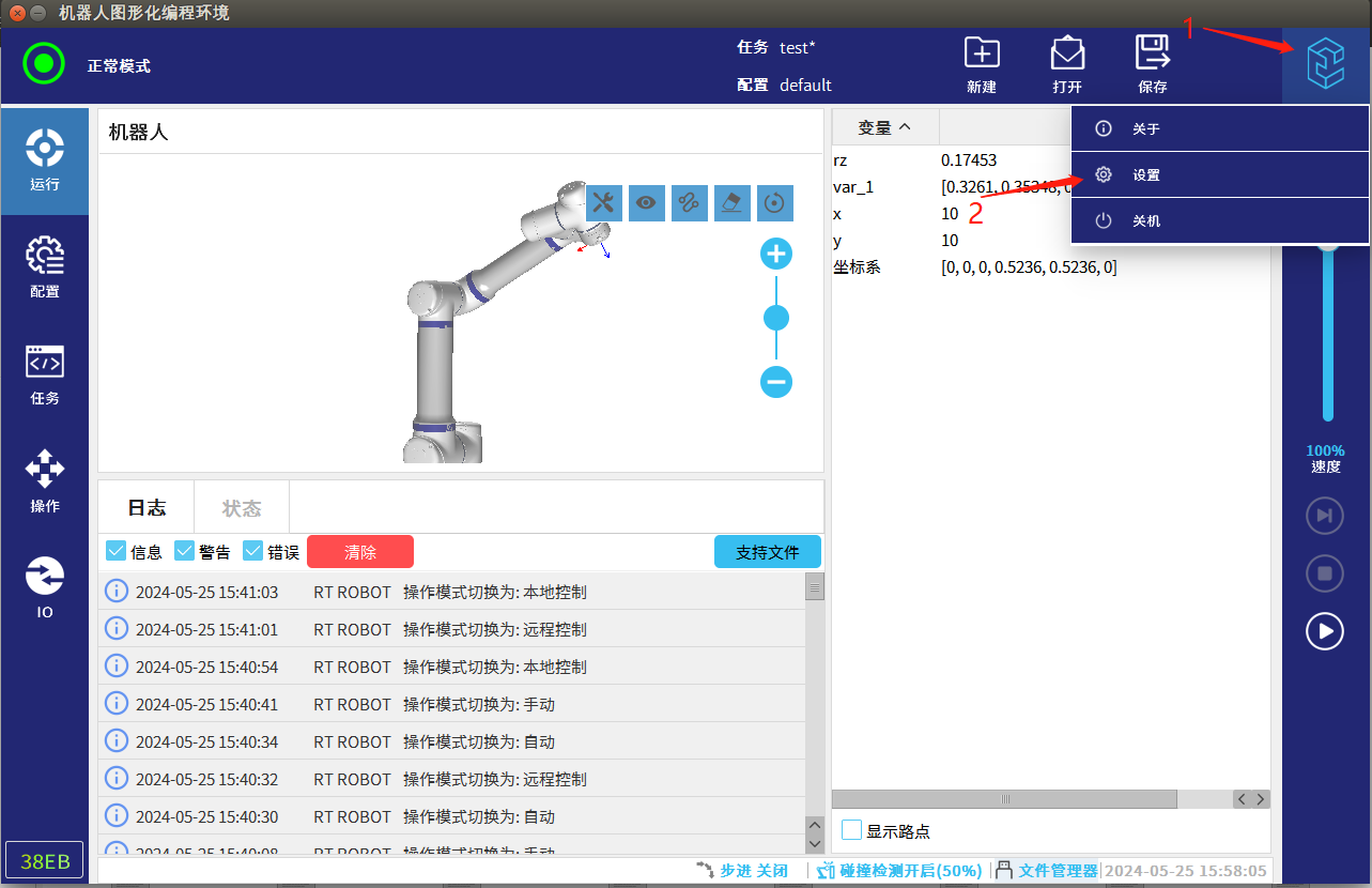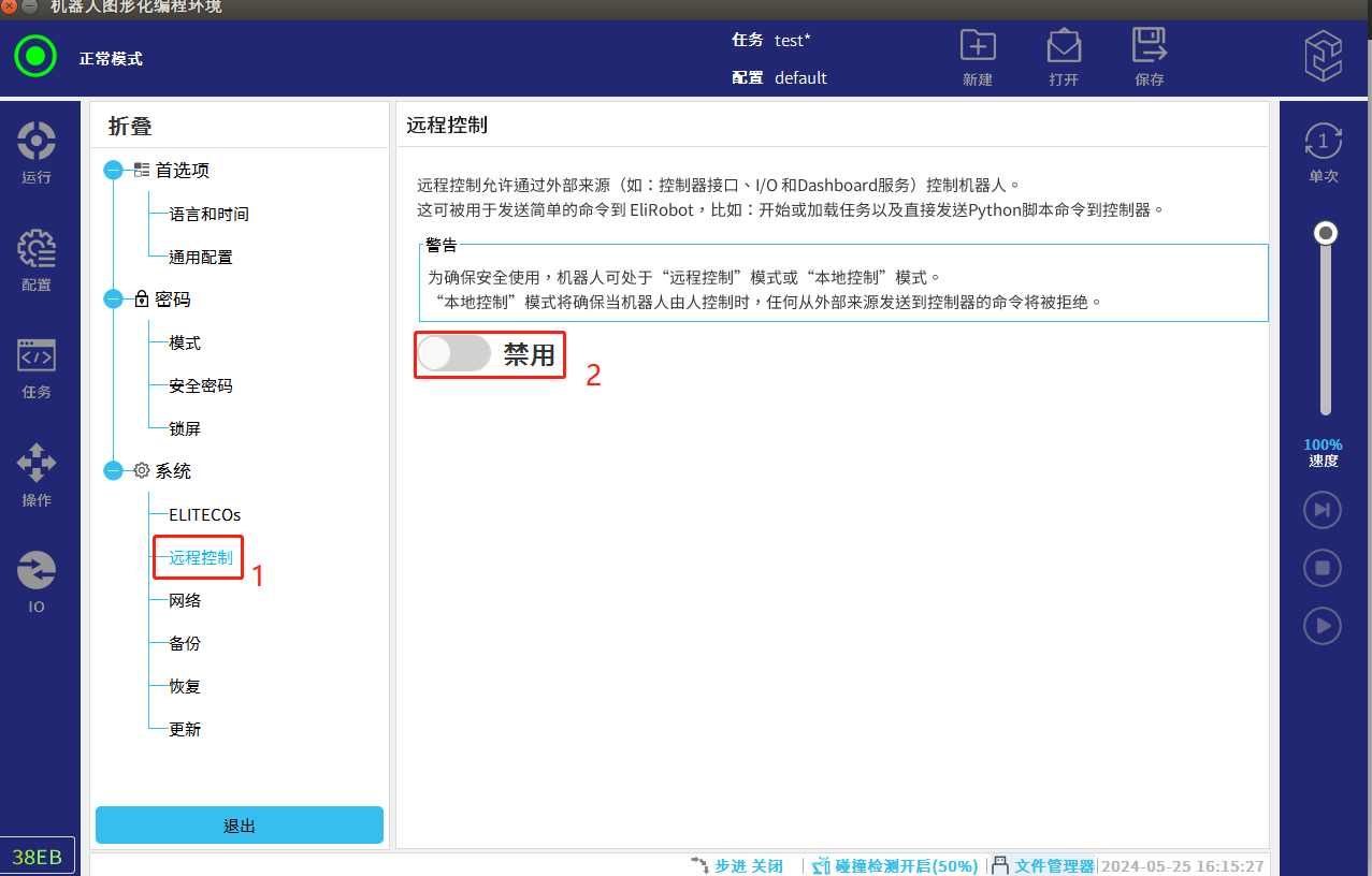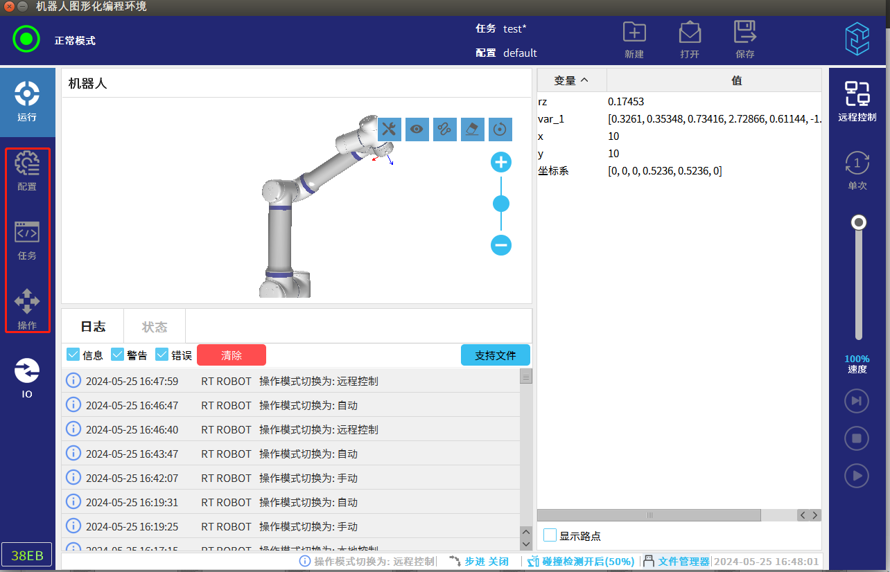 遠程模式即為可以通過遠程控制器來控制機器人的運動,例如通過Modbus,Ethernet,Profinet等通訊遠程控制實現(xiàn)機器人的運行