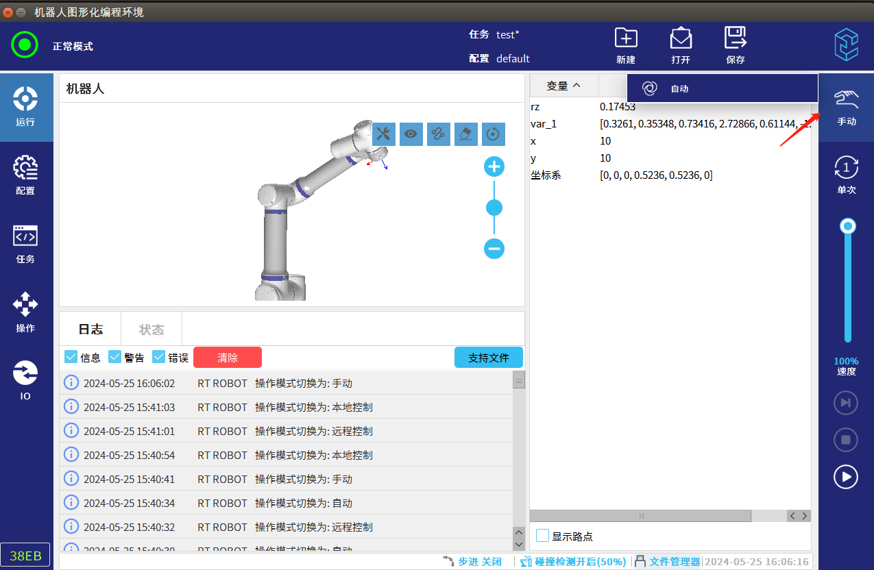 手動模式即機器人需要用示教器來控制機器人的移動,一般用于調(diào)試階段,進行點位示教以及流程驗證