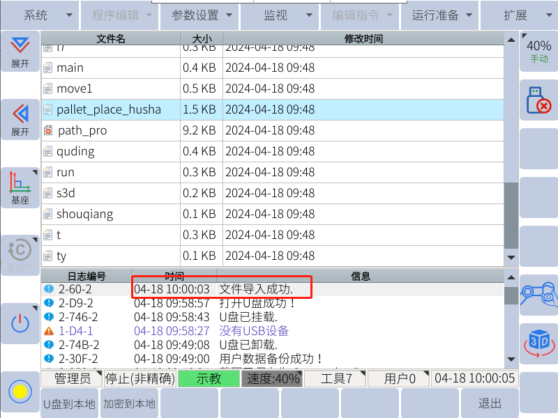 檢查示教器屏幕左上方是否彈出u盤圖標,