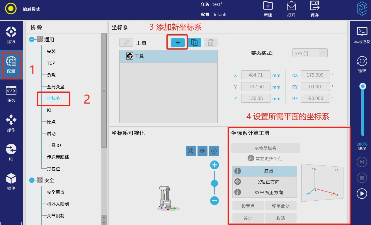 要設置安全平面需要先設置一個坐標系,因為安全平面是基于你設置的坐標系的X,Y平面的Z方向平移來確定具體位置的。用戶坐標系的設置請參照用戶手冊上面設置。