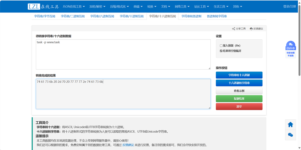 在手冊中找出切換任務(wù)的字符串是’task -p’ ,在網(wǎng)址中把字符串轉(zhuǎn)換為16進(jìn)制,如下圖,切換到www任務(wù),再將轉(zhuǎn)換后的16進(jìn)制字符串發(fā)送給機(jī)器人切換任務(wù)。